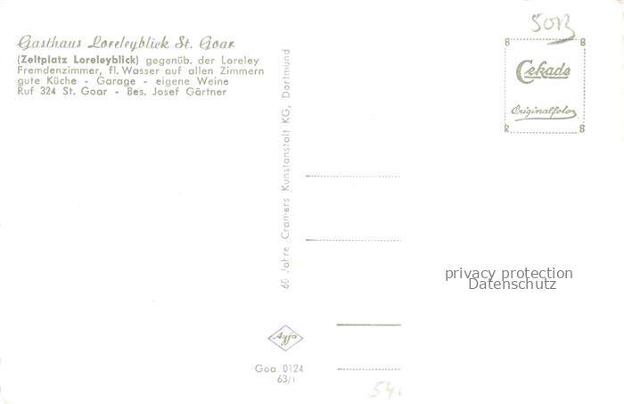 74098196 St Goar Rhein Gasthaus Loreleyblick Zeltplatz Fahrgastschiff postalisch nicht gelaufen Erhaltung siehe scans [WerneD78] KatCode: 11110007140133