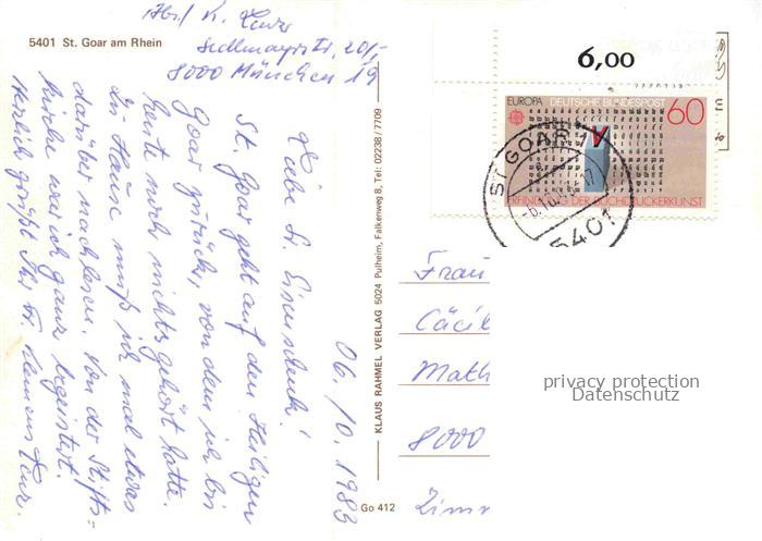 74157610 alte Postkarte St Goar Rhein Rhein Felsen Schiffe Altstadt Kirche Bahnstrecke Burgtor postalisch gelaufen Fliegeraufnahme Erhaltung siehe scans [Karloger] KatCode: 11110007140133