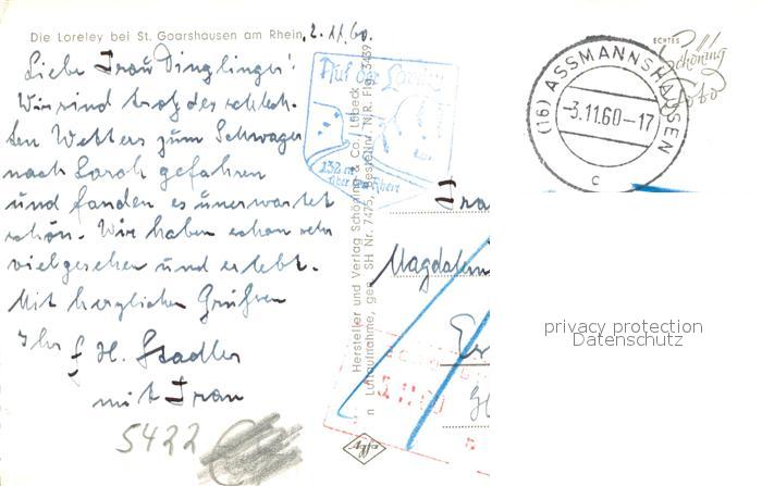 73645656 alte Postkarte St Goarshausen Die Loreley Felsen Rheintal postalisch gelaufen Erhaltung siehe scans [FriedD77] KatCode: 11110007141121