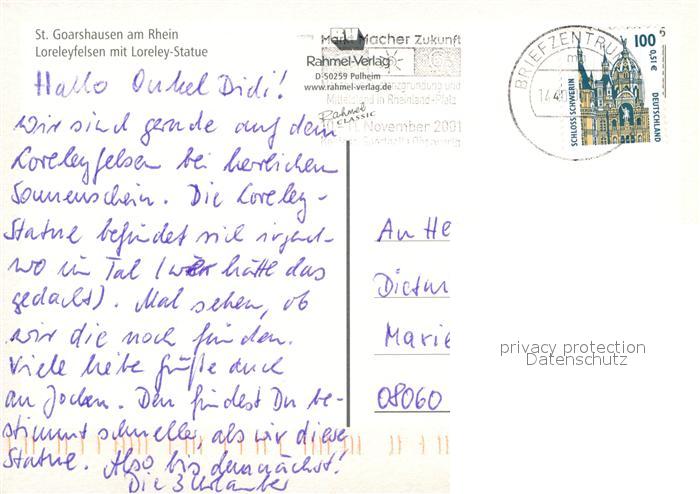 72971487 alte Postkarte St Goarshausen Loreleyfelsen mit Loreley Statue Sagenfigur postalisch gelaufen Erhaltung siehe scans [FriedD77] KatCode: 11110007141121