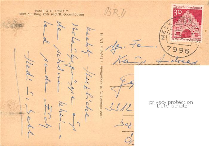 73129739 alte Postkarte St Goarshausen Raststaette Loreley Burg Katz postalisch gelaufen Erhaltung siehe scans [NatalD47] KatCode: 11110007141121