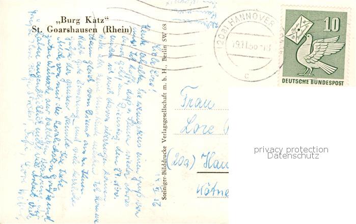 73810711 St Goarshausen Rhein Burg Katz postalisch gelaufen Erhaltung siehe scans [WerneD78] alte Postkarte Wern Katcode 11110007141121