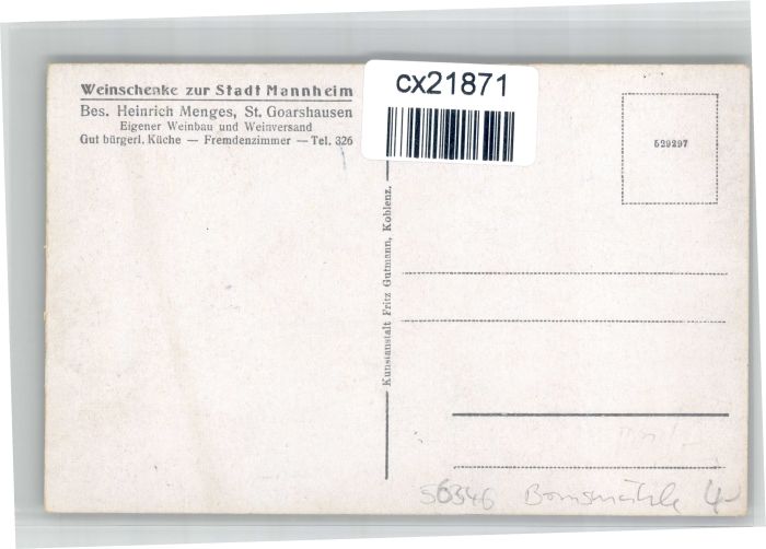 30740601 St Goarshausen Weinschenke zur Stadt Mannheim postalisch nicht gelaufen KatCode: 11110007141121