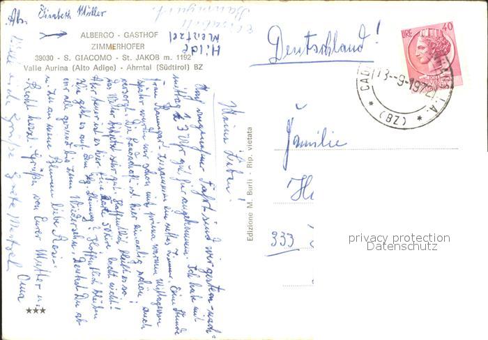 old postcard St Jakob Ahrntal Albergo Gasthof Zimmerhofer Gastraum Ortsblick postalisch gelaufen Erhaltung siehe scans