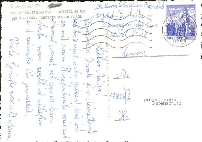 71566622 alte Postkarte St Jakob Defereggen Oberseehuette Alpengasthaus Obersee am Stallersattel Gebirgspass postalisch gelaufen Erhaltung siehe scans KatCode: 11390333070724