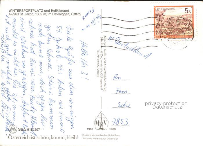 72437566 alte Postkarte St Jakob Defereggen Ski postalisch gelaufen Erhaltung siehe scans KatCode: 11390333070724