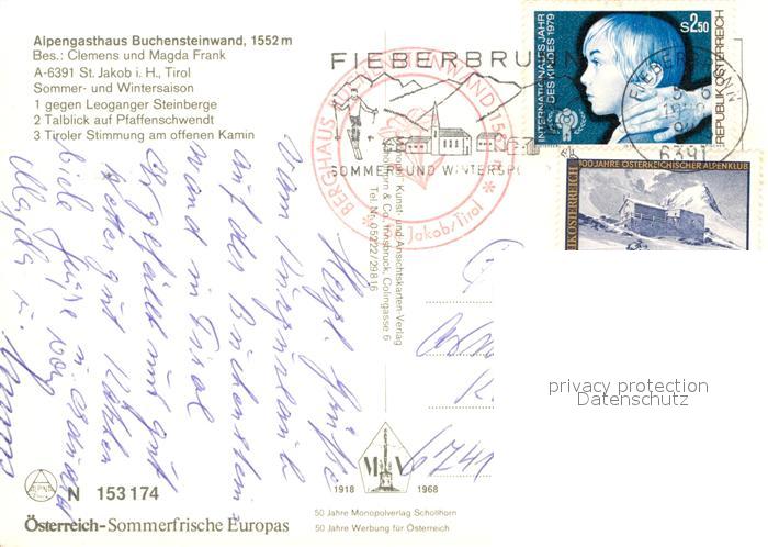 72950711 alte Postkarte St Jakob Haus Alpengasthof Buchensteinwand Leoganger Steinberge Talblick auf Pfaffenschwendt Kaminstimmung postalisch gelaufen Erhaltung siehe scans [WerneD78] KatCode: 11390335070415