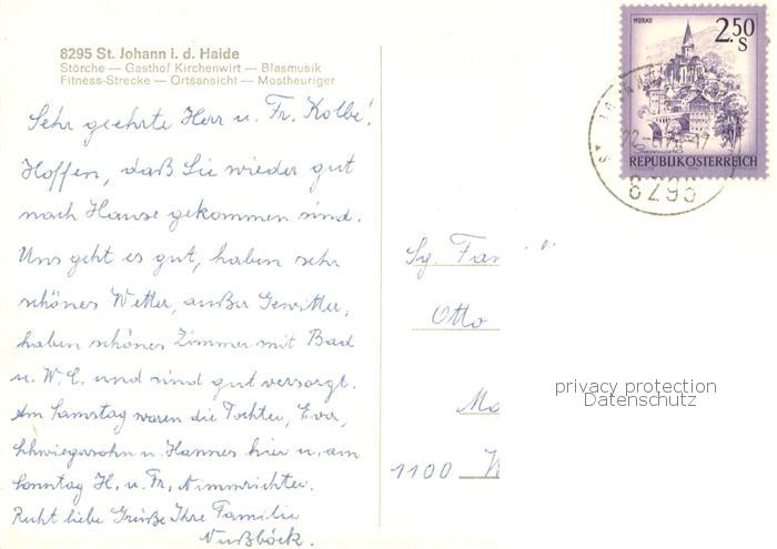73762167 alte Postkarte St Johann Haide Stoerche Gasthof Kirchenwirt Blasmusik Fitness Ortsansicht Mostheuriger postalisch gelaufen Erhaltung siehe scans [FriedD77] KatCode: 11390224060710