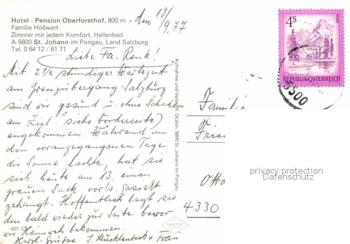 72674693 alte Postkarte St Johann Pongau Hotel Pension Oberforsthof postalisch gelaufen Erhaltung siehe scans [WerneD78] KatCode: 11390