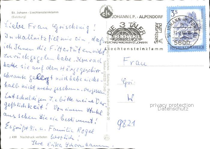 72376602 alte Postkarte St Johann Pongau Liechtensteinklamm Schlucht Wasserfall Kirche Alpenpanorama postalisch gelaufen Erhaltung siehe scans KatCode: 11390