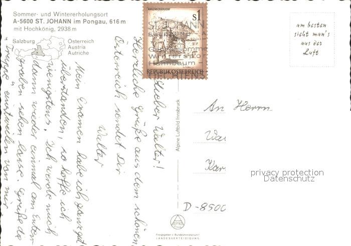 72072082 alte Postkarte St Johann Pongau Salzburg Hochkoenig Fliegeraufnahme postalisch gelaufen Erhaltung siehe scans KatCode: 11390