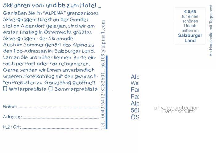 72714531 St Johann Pongau Wellness und Sporthotel Alpina Wintersportplatz Alpen postalisch nicht gelaufen Werbekarte (keine Postkarte) Erhaltung siehe scans [FriedD77] KatCode: 11390