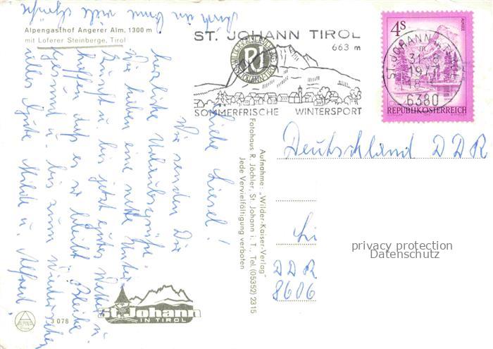 74044193 alte Postkarte St Johann Tirol AT Alpengasthof Angerer Alm mit Loferer Steinberge postalisch gelaufen Erhaltung siehe scans [WerneD78] KatCode: 11390335070416
