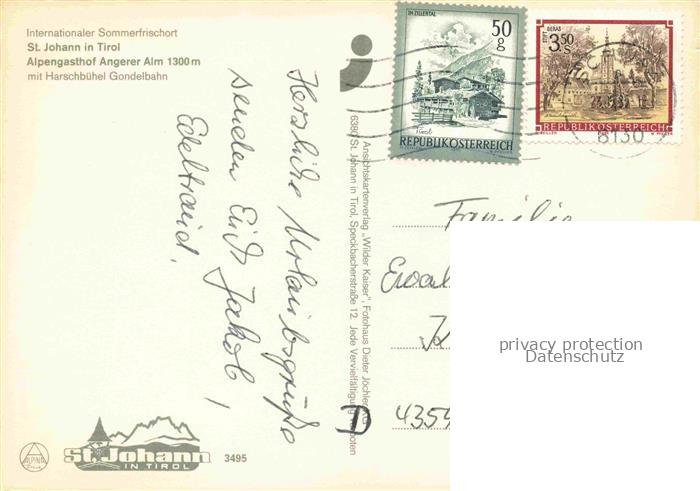 74141860 alte Postkarte St Johann Tirol AT Panorama Alpengasthof Angerer Alm Harschbuehel Gondelbahn postalisch gelaufen Erhaltung siehe scans [FriedD77] KatCode: 11390335070416