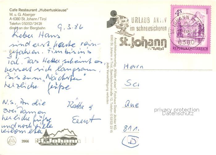 73589070 alte Postkarte St Johann Tirol Cafe-Restaurant Hubertusklause postalisch gelaufen Erhaltung siehe scans [PaolaD17] KatCode: 11390335070416