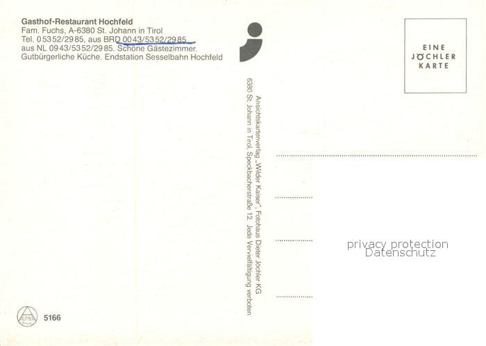 73185226 St Johann Tirol Gasthof-Restaurant Hochfeld postalisch nicht gelaufen Erhaltung siehe scans [LiesaD40] KatCode: 11390335070416