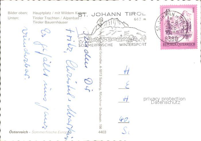 71708949 alte Postkarte St Johann Tirol Hauptplatz Tiroler Trachten Alpenbad Erholungszentrum Bauernhaeuser Reiten Kaisergebirge postalisch gelaufen Erhaltung siehe scans KatCode: 11390335070416