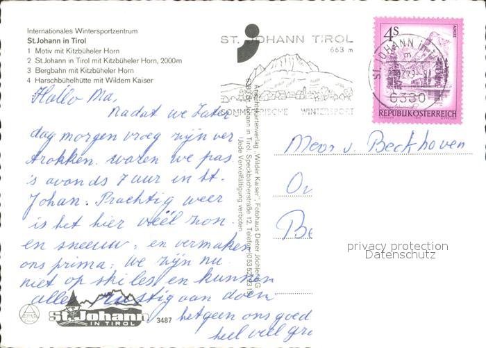 72094833 alte Postkarte St Johann Tirol Motiv mit Kitzbueheler Horn Totalansicht Bergbahn Harschbuehelhuette mit Wildem Kaiser postalisch gelaufen Erhaltung siehe scans KatCode: 11390335070416