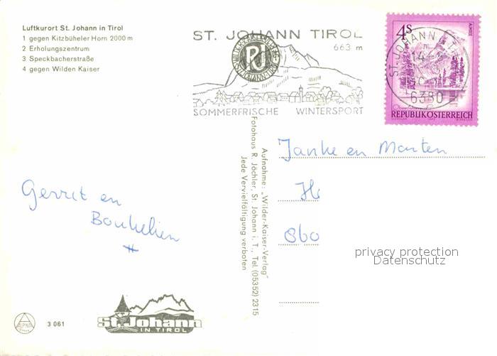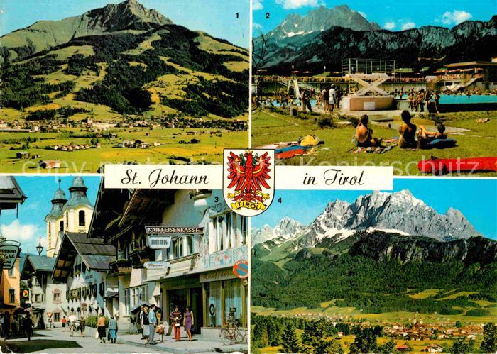 72898050 alte Postkarte St Johann Tirol Panorama Kitzbueheler Horn Schwimmbad Speckbacherstrasse Wilder Kaiser postalisch gelaufen Erhaltung siehe scans [FriedD77] KatCode: 11390335070416
