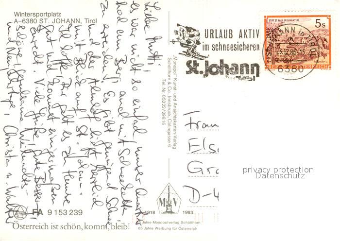 73359457 alte Postkarte St Johann Tirol Panorama Teilansichten Pferdeschlitten Langlauf Drachenflieger Hirsche postalisch gelaufen Erhaltung siehe scans [WerneD78] KatCode: 11390335070416