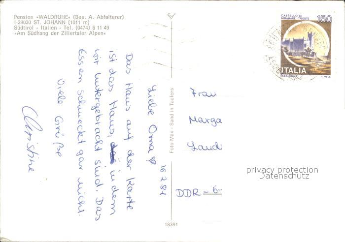 72458114 alte Postkarte St Johann Tirol Pension Waldruhe Zillertaler Alpen postalisch gelaufen Erhaltung siehe scans KatCode: 11390335070416