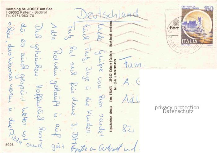 74080171 old postcard St Josef am See Kaltern Caldaro Bolzano IT Campingplatz Panorama postalisch gelaufen Erhaltung siehe scans [WerneD78] KatCode: 11240
