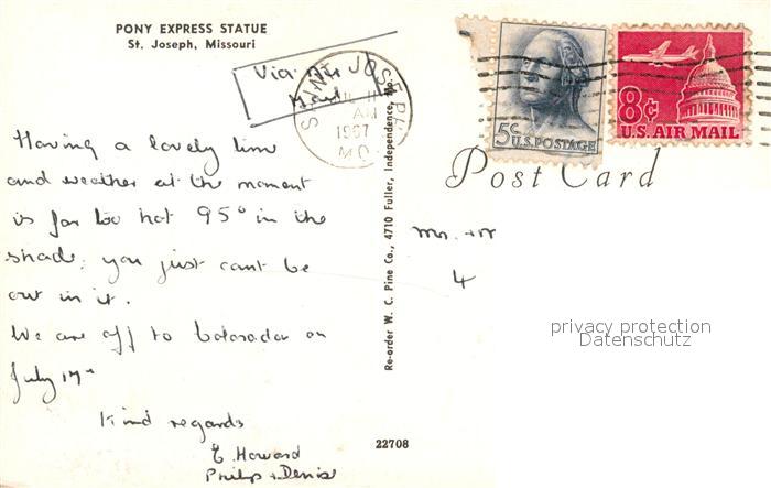 73061624 old postcard St Joseph Missouri Pony Express Statue postalisch gelaufen Erhaltung siehe scans [WerneD78] KatCode: 14140270000000