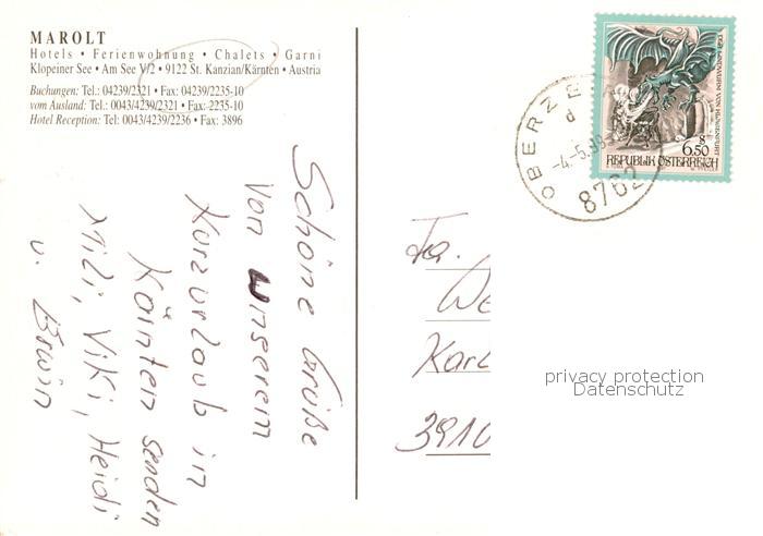 73856051 alte Postkarte St Kanzian Klopeiner See Kaernten AT Marolt Hotel am See postalisch gelaufen Erhaltung siehe scans [FriedD77] KatCode: 11390213020813