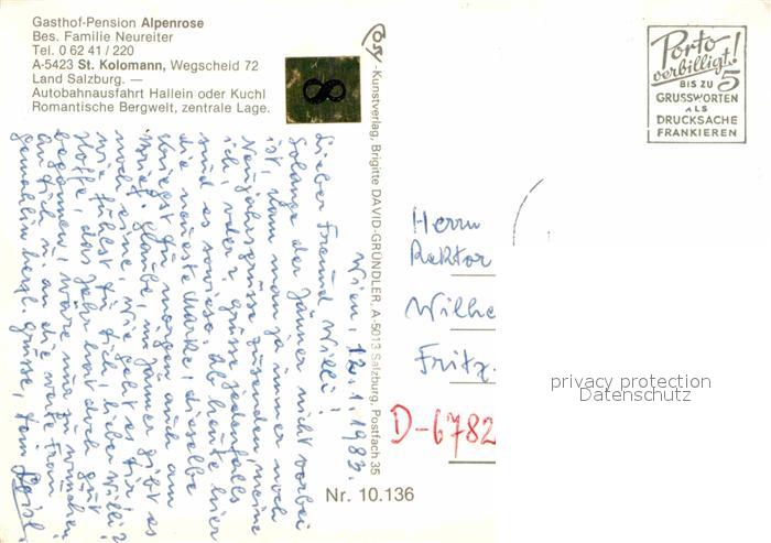 72668375 alte Postkarte St Koloman Gasthof Pension Alpenrose postalisch gelaufen Erhaltung siehe scans [WerneD78] KatCode: 11390