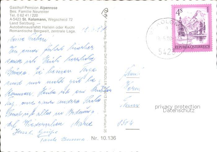 72284909 alte Postkarte St Koloman Gasthof-Pension Alpenrose postalisch gelaufen Erhaltung siehe scans KatCode: 11390