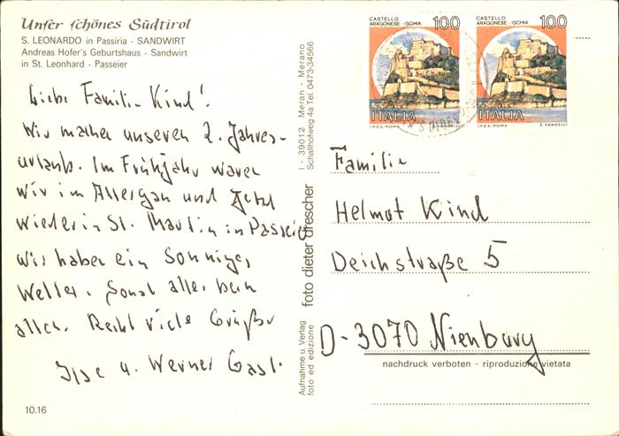 old postcard St Leonhard Passeier Gasthaus Sandwirt Andreas Hofer Geburtshaus postalisch gelaufen