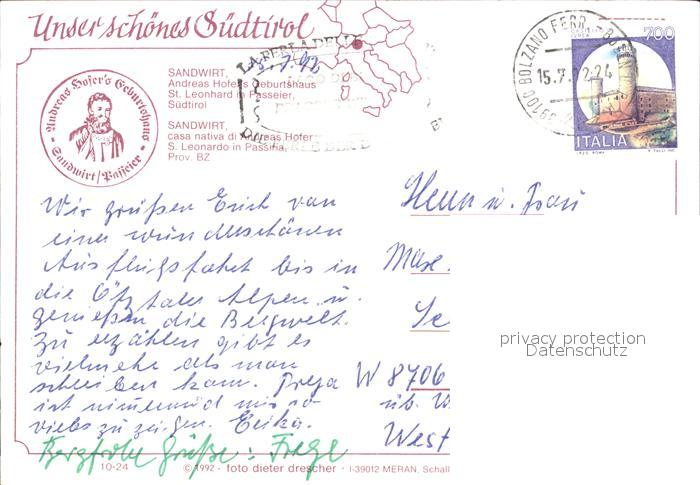 old postcard St Leonhard Passeier Sandwirt Andreas Hofers Geburtshaus postalisch gelaufen Erhaltung siehe scans