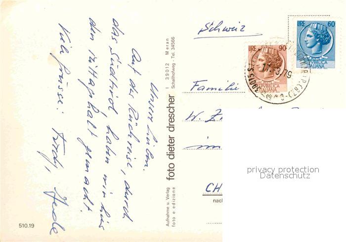 alte Postkarte St Leonhard Passeier Teilansichten Dorfplatz Kirche Schwimmbad Bergstrasse postalisch gelaufen Erhaltung siehe scans [WerneD78]
