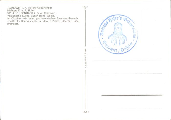 71484447 St Leonhard Sandwirt A. Hofers Geburtshaus postalisch nicht gelaufen Erhaltung siehe scans KatCode: 11390323050314
