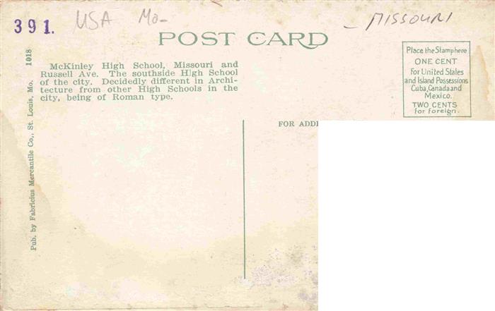 73973418 St Louis Missouri MO USA McKinley High School postalisch nicht gelaufen Erhaltung siehe scans [FriedD77] KatCode: 14140