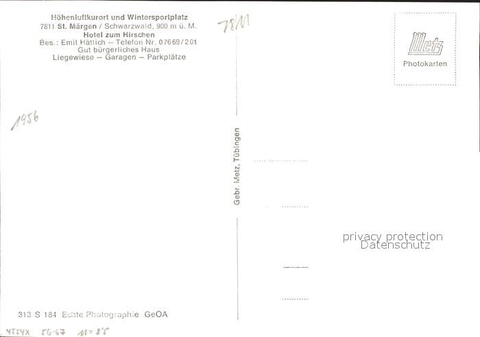 31734779 St Maergen Hotel zum Hirshen Emit Haettich postalisch nicht gelaufen Erhaltung siehe scans KatCode: 11110008315094