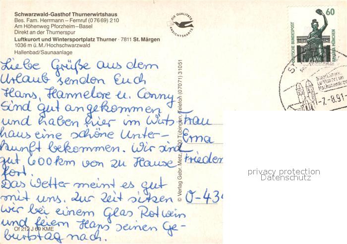 73126872 alte Postkarte St Maergen Schwarzwald Gasthof Thurnerwirtshaus postalisch gelaufen Erhaltung siehe scans [KathaD81] KatCode: 11110008315094