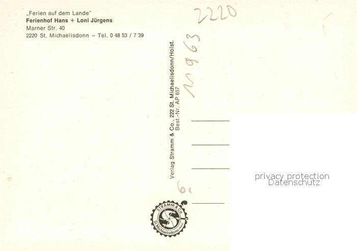 73642496 St Michaelisdonn Ferienhof Hans und Loni Juergens Schimmel postalisch nicht gelaufen Erhaltung siehe scans [WerneD78] KatCode: 11110001051097