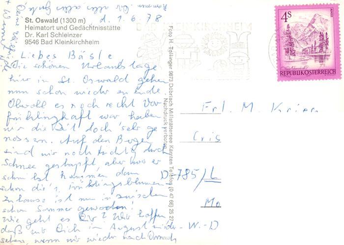 73906153 alte Postkarte St Oswald Bad Kleinkirchheim Kaernten AT Gedaechtnisstaette Dr Karl Schleinzer Kirche Wohnhaus postalisch gelaufen Erhaltung siehe scans [WerneD78] KatCode: 11390212020601