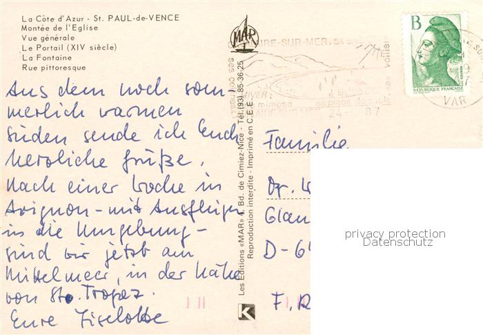 13843524 St-Paul-de-Vence 06 Montee de l’Eglise Vue generale Le Portail La Fontaine Rue pittoresque postalisch gelaufen Erhaltung siehe scans [FriedD77] carte postale Frie Katcode 11170006106044
