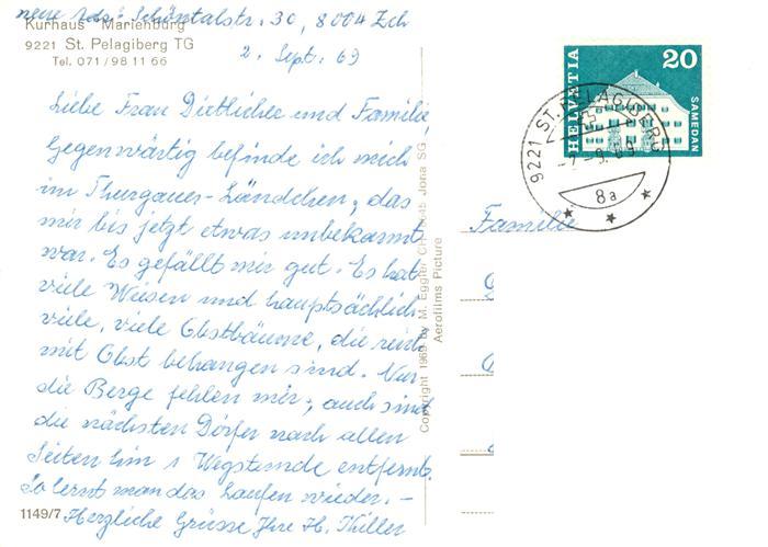 13874815 alte Postkarte St Pelagiberg TG Fliegeraufnahme mit Kurhaus Marienburg und Kirche postalisch gelaufen Erhaltung siehe scans [WerneD78] KatCode: 11470200605008