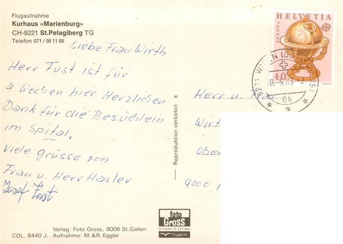 13875958 alte Postkarte St Pelagiberg TG Kurhaus Marienburg Fliegeraufnahme mit Kirche postalisch gelaufen Erhaltung siehe scans [WerneD78] KatCode: 11470200605008