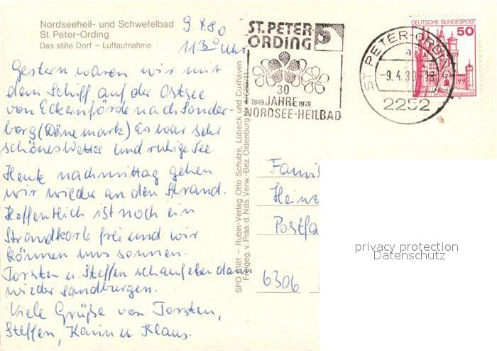 73127559 alte Postkarte St Peter-Ording Nordseeheilbad Schwefelbad Das stille Dorf Luftaufnahme postalisch gelaufen Erhaltung siehe scans [FriedD77] KatCode: 11110001054113
