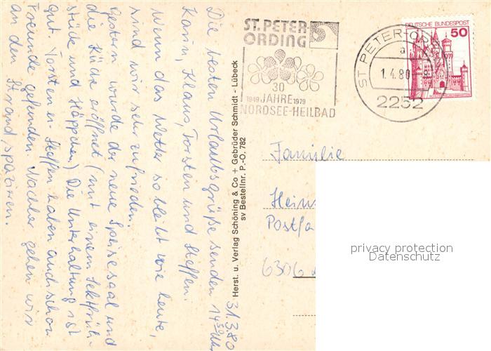 73127553 alte Postkarte St Peter-Ording Seebruecke Wellenbad Strandsegler Leuchtturm Duene Sturmflut Kurpark postalisch gelaufen Erhaltung siehe scans [FriedD77] KatCode: 11110001054113