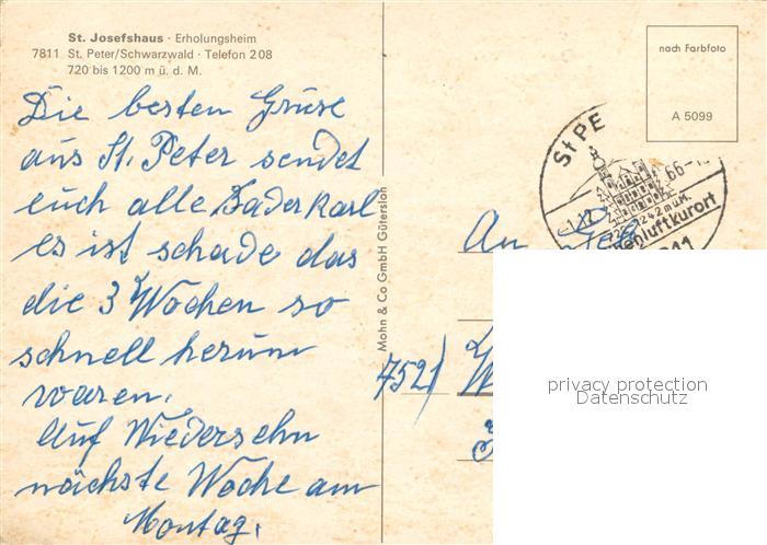 73634749 alte Postkarte St Peter Schwarzwald St. Josefshaus Erholungsheim postalisch gelaufen Erhaltung siehe scans [FriedD77] KatCode: 11110008315095