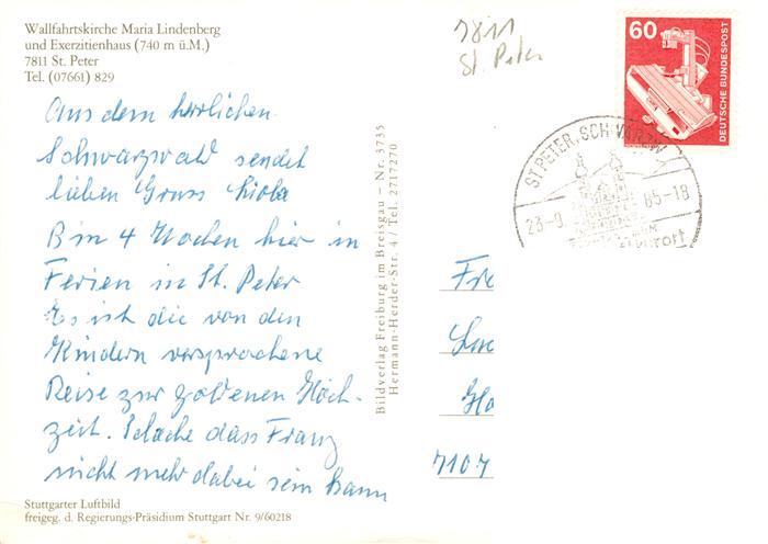 73929374 alte Postkarte St Peter Schwarzwald Wallfahrtskirche Maria Lindenberg mit Haus Maria Lindenberg und Pilgergaststaette Fliegeraufnahme postalisch gelaufen Erhaltung siehe scans [FriedD77] KatCode: 11110008315095