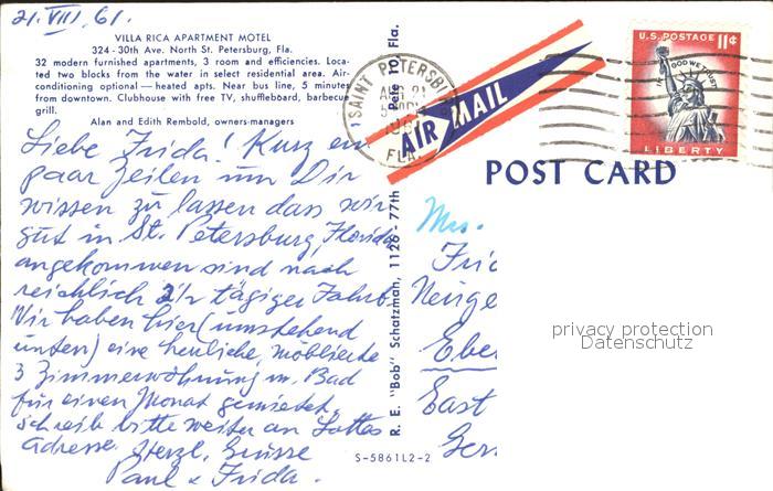 72134166 old postcard St Petersburg Florida Villa Rica Apartment Hotel postalisch gelaufen Erhaltung siehe scans KatCode: 14140110000000