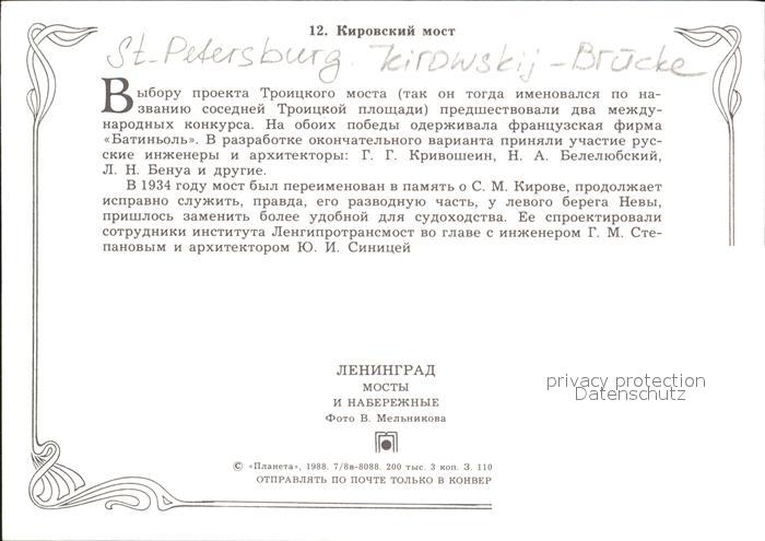 St Petersburg Leningrad Kiroswskij Bruecke Uferstrasse postalisch nicht gelaufen Erhaltung siehe scans