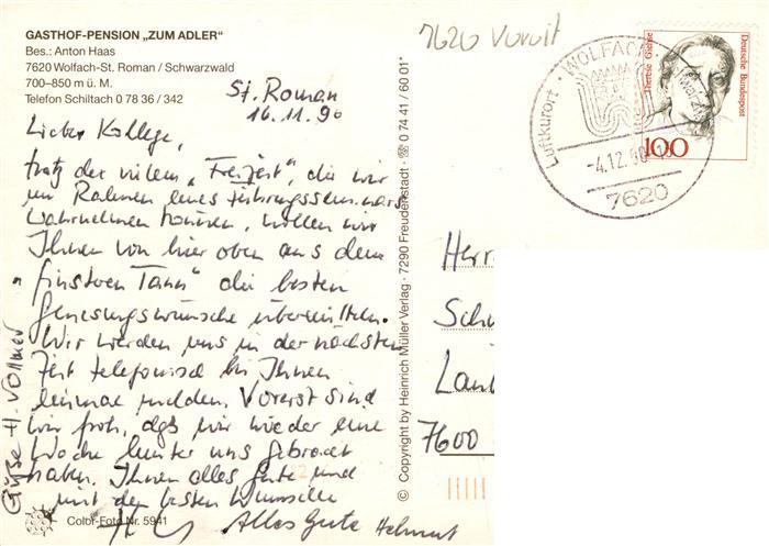 73930825 alte Postkarte St Roman Wolfach Gasthof Pension Zum Adler postalisch gelaufen Erhaltung siehe scans [FriedD77] KatCode: 11110008317145
