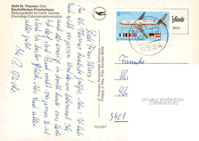 72838606 alte Postkarte St Thomas Eifel Fliegeraufnahme Bischoefliches Priesterhaus postalisch gelaufen Erhaltung siehe scans [AndreD76] KatCode: 11110007232113